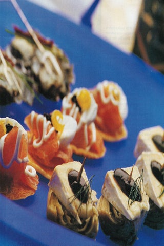 Cut marinated artichoke hearts in half. Arrange a small piece of blue cheese on top of each with a slice of olive. Pierce with a skewer to hold and decorate with a piece of dill.